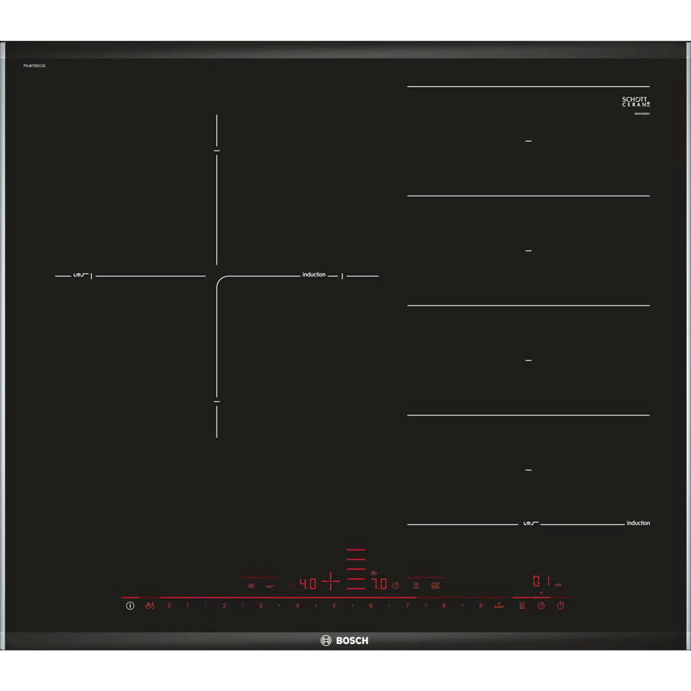 Bosch PXJ675DC1E sở hữu thiết kế vuông vắn với 4 vùng nấu độc lập, tối ưu không gian bếp. Đặc biệt, vùng nấu hỗn hợp có kích thước lớn 380 x 240 mm, cho phép sử dụng với nhiều loại nồi chảo có hình dạng khác nhau. Thiết kế vát cạnh tinh tế kết hợp với khung thép không gỉ giúp tăng tính thẩm mỹ và độ bền cho sản phẩm.