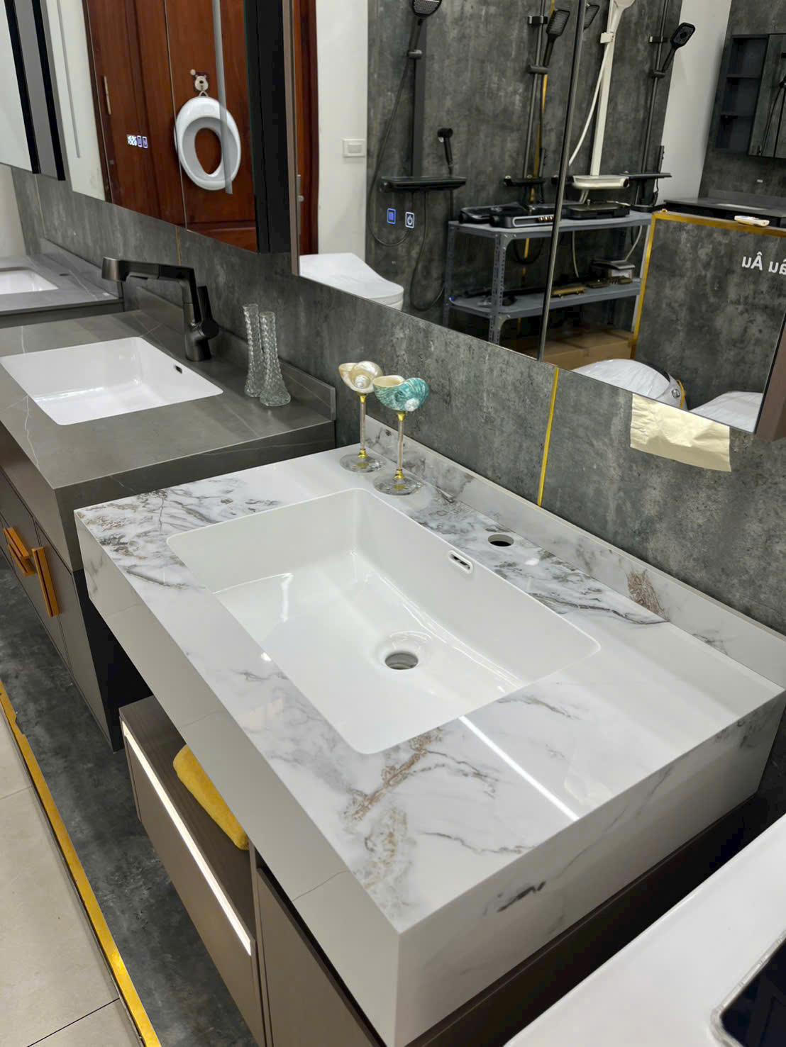 Chậu lavabo âm bàn được lắp đặt ẩn hoàn toàn dưới mặt đá, tạo tổng thể liền mạch, gọn gàng. Thiết kế này giúp hạn chế đọng nước, dễ vệ sinh và phù hợp với xu hướng nội thất phòng tắm cao cấp hiện nay.
