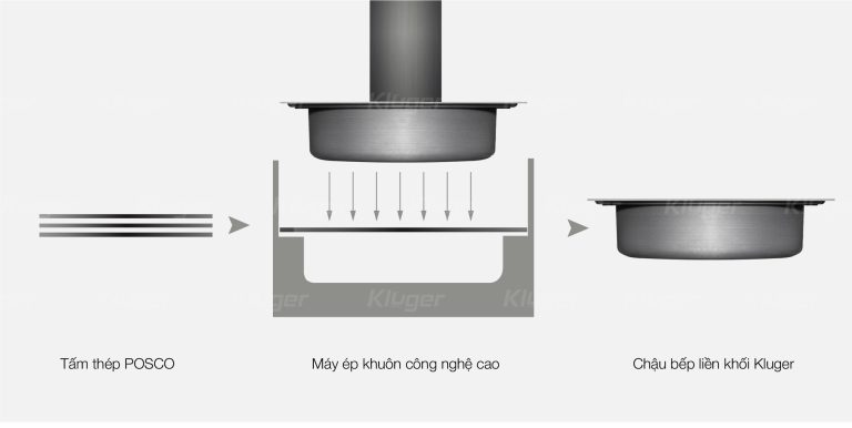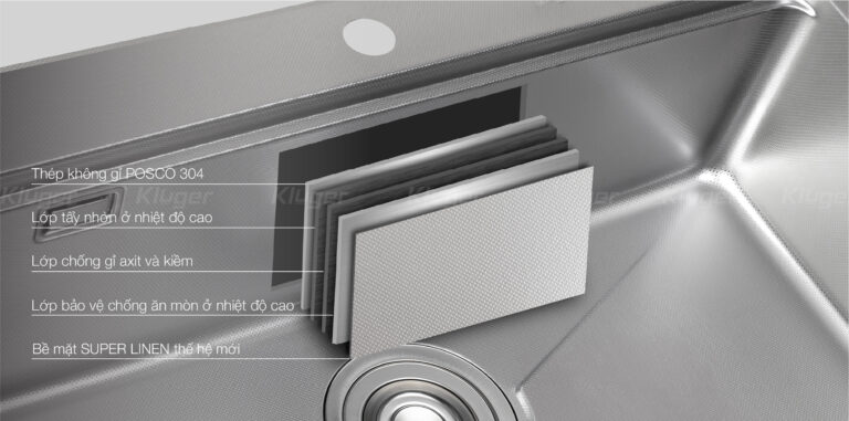 Kluger áp dụng công nghệ ép khuôn liền khối hiện đại, chế tác chậu rửa từ một tấm inox POSCO 304 nguyên khối – không mối hàn, không ghép nối. Nhờ vậy, sản phẩm đạt độ liền lạc tuyệt đối, kết cấu vững chắc và bền bỉ vượt trội, đảm bảo an toàn và tin cậy dài lâu trong mọi căn bếp.