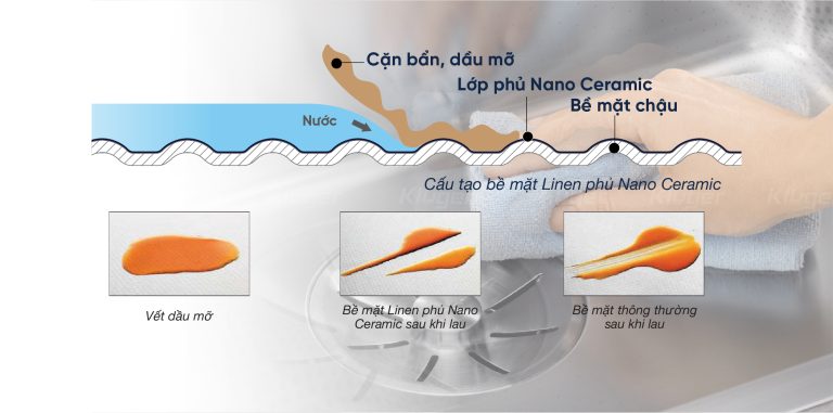 Nhờ lớp phủ Nano Ceramic siêu mịn, bề mặt chậu được bảo vệ tối đa, ngăn dầu mỡ và chất bẩn thấm bám. Khi kết hợp cùng cấu trúc LINEN thế hệ mới, chậu rửa Kluger tạo thành một lớp chắn hoàn hảo: hạn chế bám bẩn, dễ dàng vệ sinh và luôn giữ vẻ sáng bóng như mới. Người dùng có thể an tâm tận hưởng một căn bếp sạch sẽ, gọn gàng mà không tốn nhiều thời gian vệ sinh.
