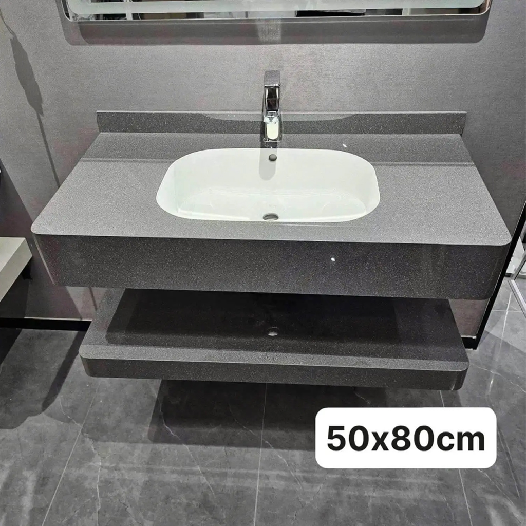 4. Bộ Bàn đá đôi bo góc và chậu âm bàn tràn viền xám