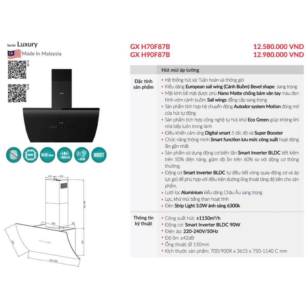 Máy hút mùi là thiết bị không thể thiếu trong gian bếp hiện đại, giúp loại bỏ khói, mùi thức ăn và dầu mỡ, mang lại không gian trong lành. Trong số các dòng sản phẩm cao cấp, GrandX GX H70F87B nổi bật với thiết kế sang trọng, công nghệ tiên tiến và hiệu suất mạnh mẽ. Hãy cùng khám phá những điểm nổi bật của sản phẩm này.