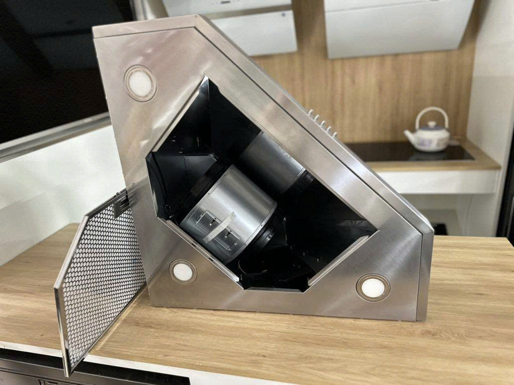 Máy hỗ trợ 2 cơ chế khử mùi: bằng than hoạt tính và ống thoát trực tiếp D150, đảm bảo hiệu quả khử mùi gần như tuyệt đối. Hệ thống lưới lọc bằng inox và hợp kim nhôm 5 lớp giúp bảo vệ động cơ khỏi dầu mỡ, dễ dàng tháo lắp để vệ sinh định kỳ. Độ ồn tối đa chỉ 48 dB, vận hành êm ái và tiết kiệm điện – chỉ tiêu hao 1 số điện sau 6–7 giờ hoạt động liên tục.