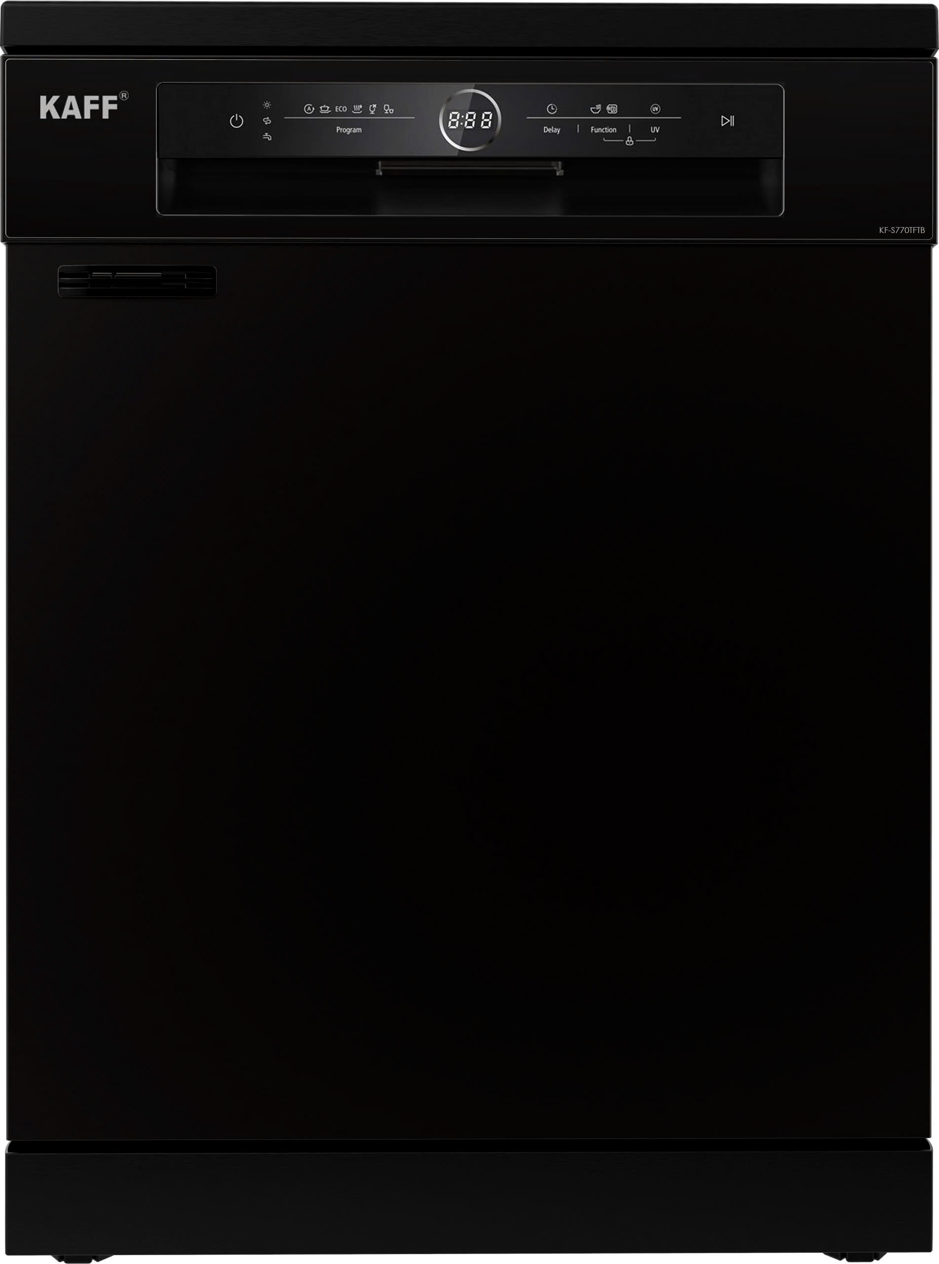 KAFF KF-S770TFTB có sức chứa lên tới 14 bộ đồ ăn Châu Âu, phù hợp với gia đình 4–6 người. Máy tích hợp 6 chương trình rửa linh hoạt: Auto, Intensive, ECO, Hygiene, Glass và Rapid – đáp ứng đầy đủ nhu cầu rửa hằng ngày lẫn chuyên sâu. Đặc biệt, máy còn được trang bị các chức năng hiện đại như sấy tăng cường Turbo Fan, khử khuẩn UV, tạo Ozon khử mùi và tăng tốc độ rửa, giúp đảm bảo bát đĩa luôn sạch sâu và an toàn cho sức khỏe.