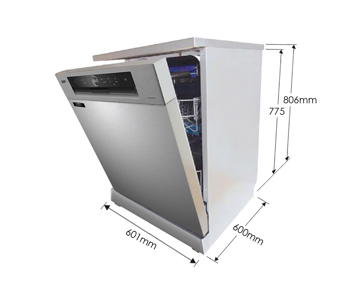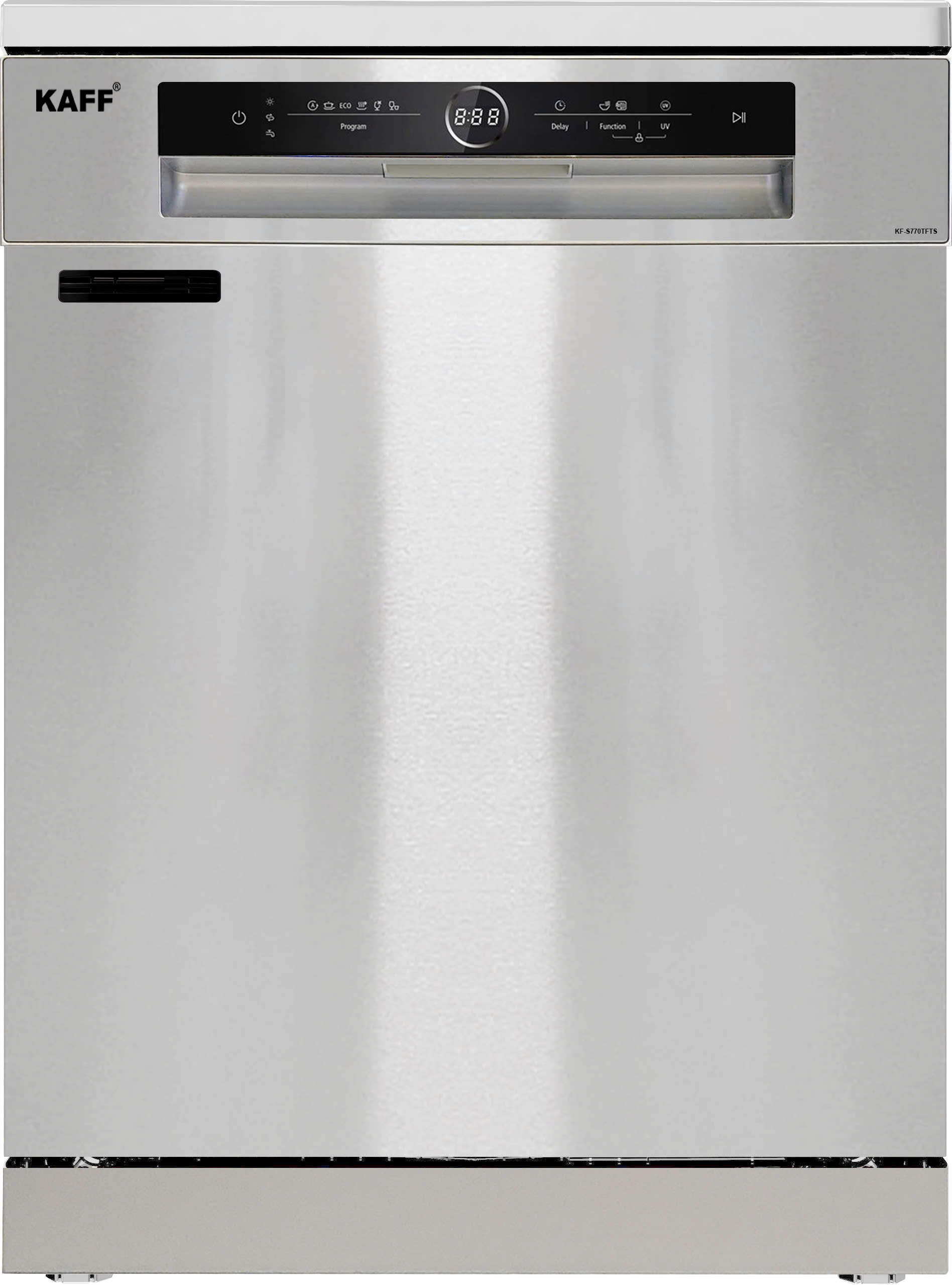 Máy rửa chén KAFF KF-S770TFTS là dòng máy cao cấp với thiết kế âm tủ hoặc độc lập linh hoạt, phù hợp hoàn hảo với bàn bếp tiêu chuẩn tại Việt Nam. Với chiều cao chỉ 775mm và chiều rộng 601mm, sản phẩm dễ dàng lắp đặt vào khoang tủ bếp mà không cần chỉnh sửa lớn. Thân máy làm từ inox cao cấp kết hợp mặt kính đen cường lực, tạo nên vẻ ngoài hiện đại, bền bỉ và sang trọng.